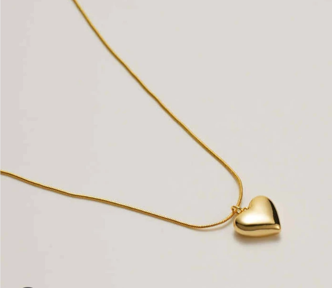 Make a bold, romantic statement with this trendy chunky heart necklace. The pendant is a large, smooth, and polished puffy heart with a high-shine gold finish. It hangs from a chic snake chain, giving it a luxurious, expensive feel. This piece is perfect for capturing the popular vintage-revival aesthetic and adds instant glamour to any look.