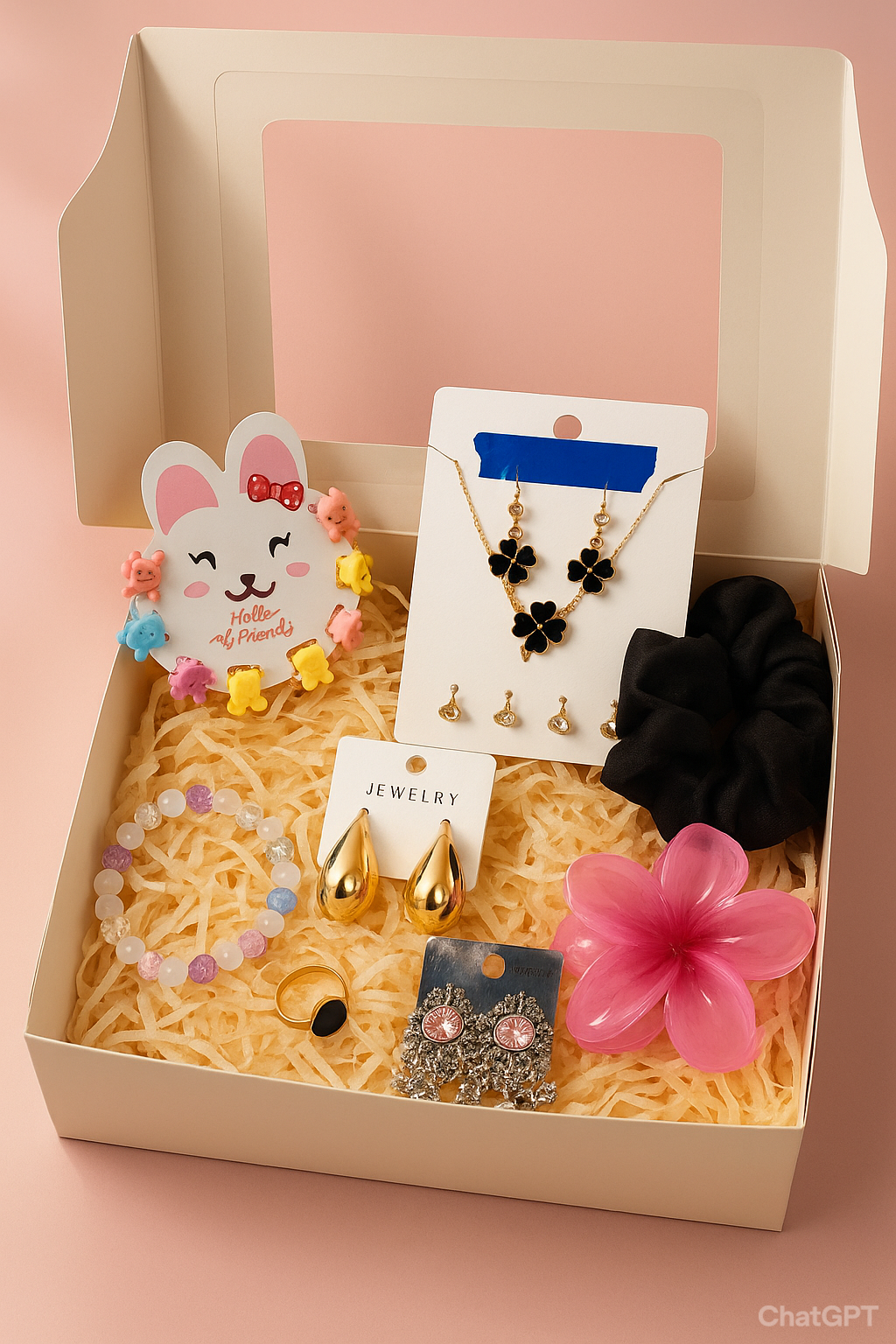 A delightful gift box packed with trendy accessories. The box includes a black clover necklace and earring set, a pair of chunky gold teardrop earrings, a sparkly rhinestone dangle earring pair, a beaded bracelet, a small ring, and fun items like a bunny card, mini hair clips, a scrunchie, and a flower clip. Perfect for teens or a fun birthday gift!