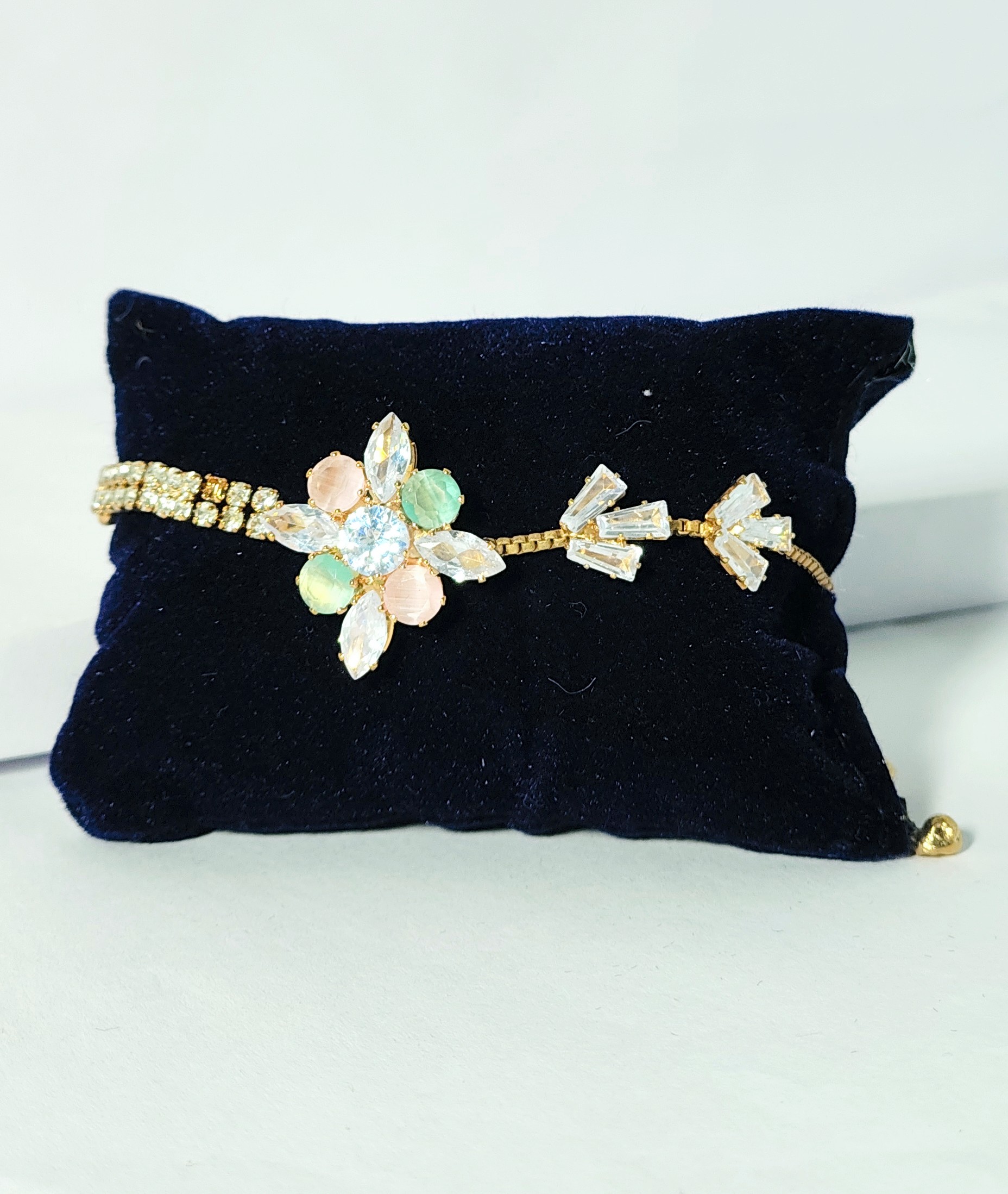 Add a touch of sparkle and sophistication to your look with this Elegant Floral Crystal Bracelet. Featuring a stunning floral centerpiece adorned with pastel-colored stones in green, peach, and white tones, this bracelet radiates charm and grace. The gold-plated adjustable chain ensures a comfortable fit, while the intricate crystal arrangement makes it perfect for festive occasions, parties, or gifting.