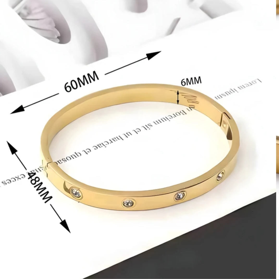 Add timeless charm to your jewelry collection with this Elegant Gold-Plated Bangle. Designed with a sleek finish and adorned with sparkling crystal stones, this bracelet blends sophistication and simplicity perfectly. Whether worn alone or stacked with other bangles, it enhances any outfit — from casual to festive.