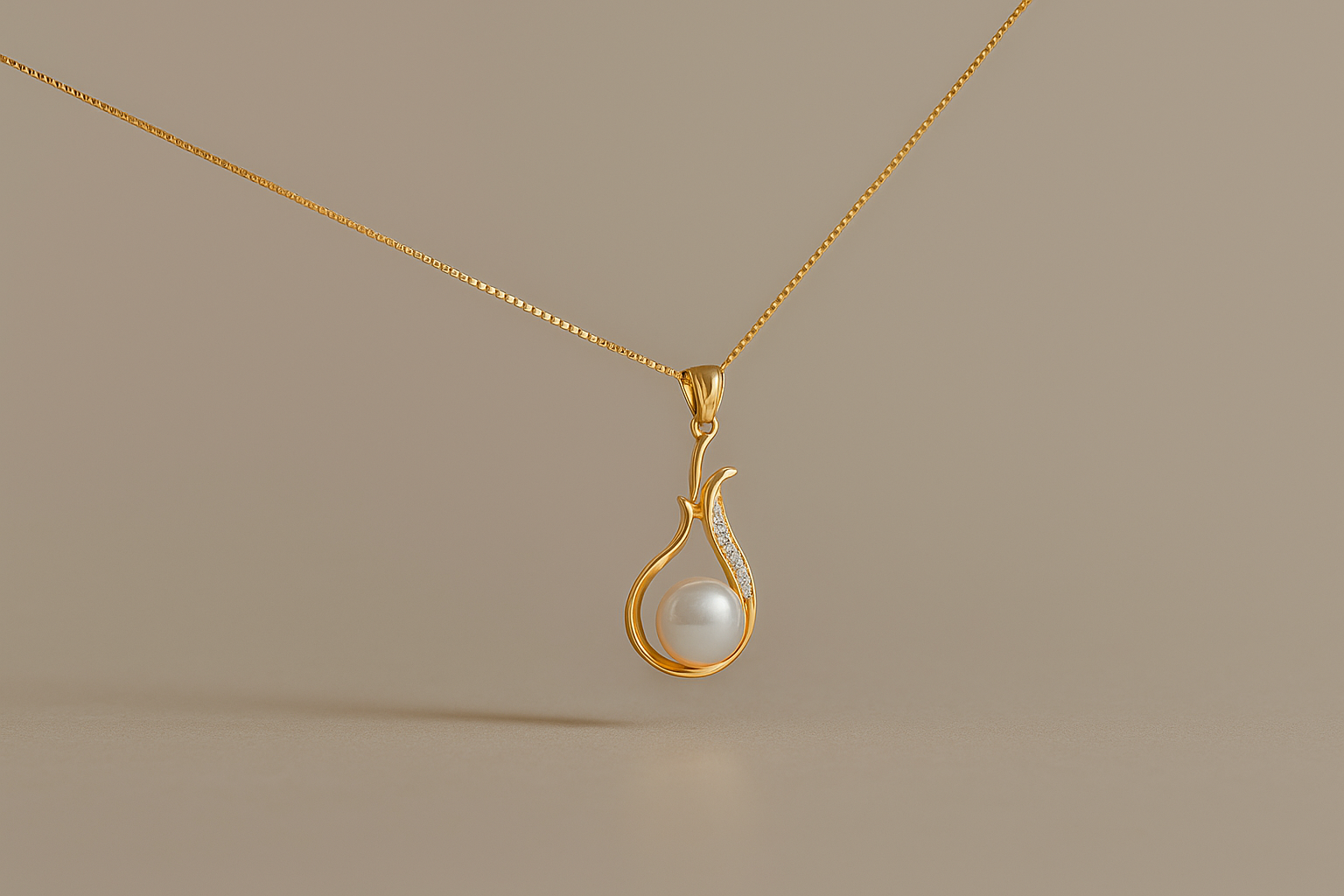 A sophisticated and feminine necklace featuring a lustrous white faux pearl suspended within a graceful, flowing gold-plated teardrop frame. The frame is accented with a delicate curve of pave cubic zirconia stones, adding subtle sparkle. This classic-meets-modern design is perfect for weddings, formal events, or a refined everyday look.