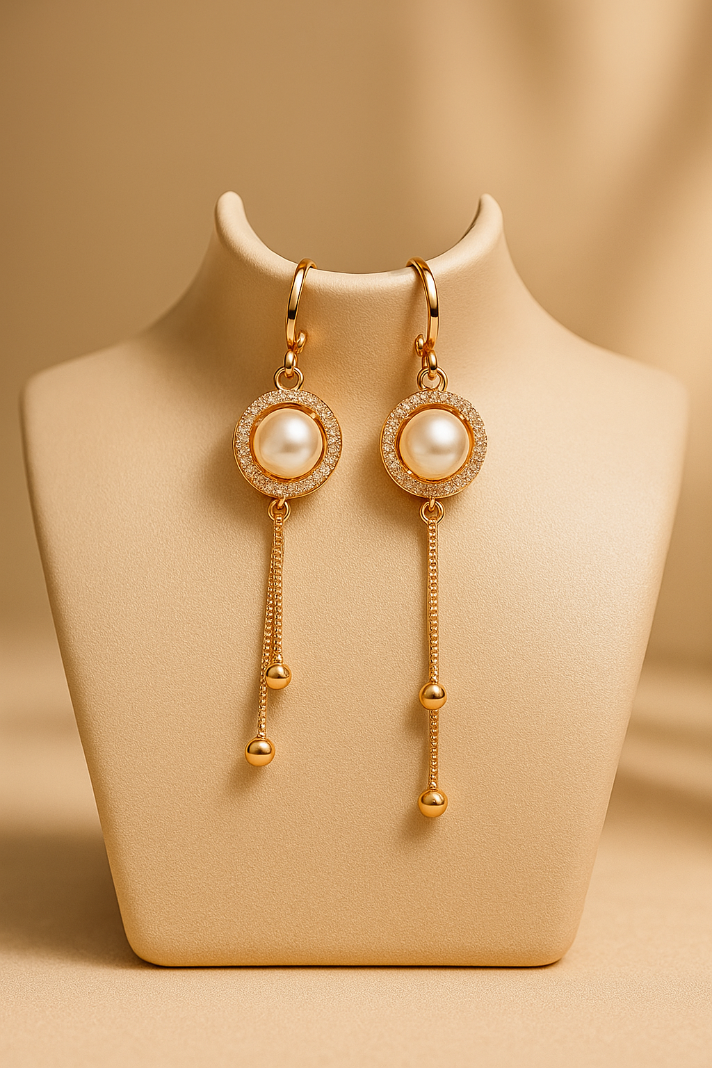 Elegant gold-tone dangle earrings featuring a beautiful faux pearl encircled by a sparkling pave rhinestone halo. The pearl setting suspends two delicate chains with gold bead accents, creating graceful movement.