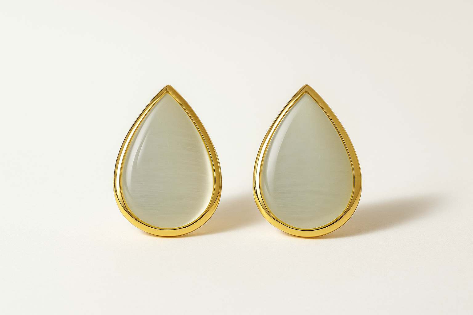 These classy stud earrings showcase a large, smooth teardrop shaped stone in a gold-tone bezel setting. The stone has a subtle, milky white or mint green cat-eye effect, giving them a beautiful and elegant shine for everyday wear or a formal look.