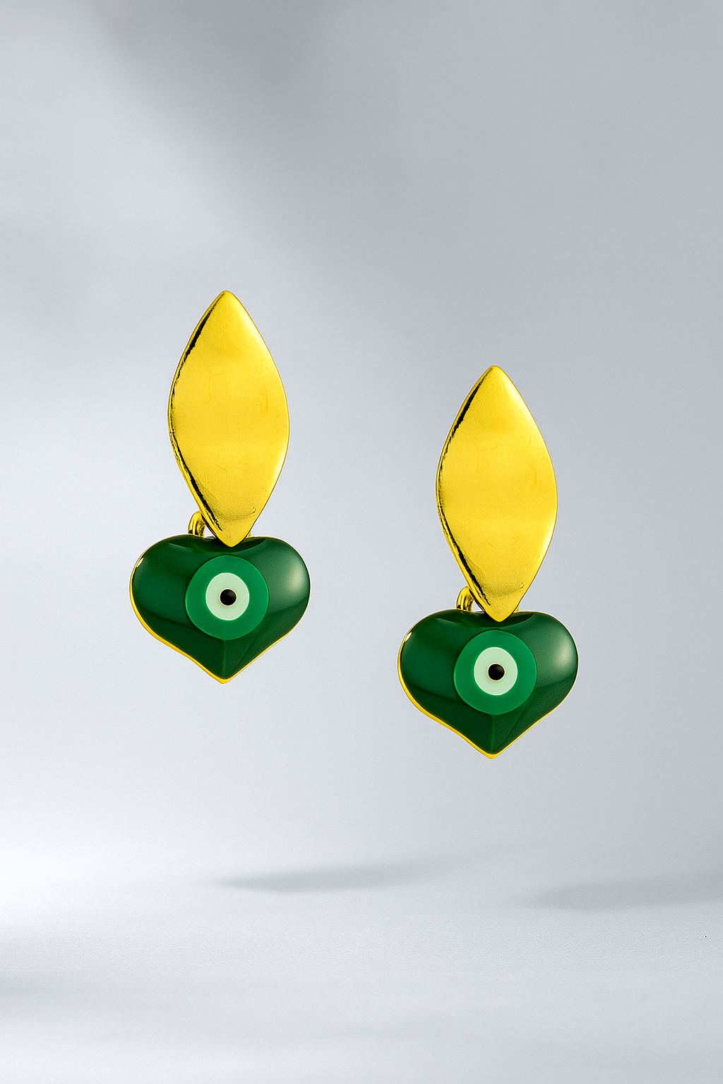 Chic and vibrant drop earrings featuring a round, deep emerald green pendant with a smaller, central Evil Eye design. The pendants hang from a brilliant faceted clear crystal stud and are set in a gold-tone bezel. These eye-catching earrings make a bold statement while carrying the classic protective charm of the Evil Eye.
