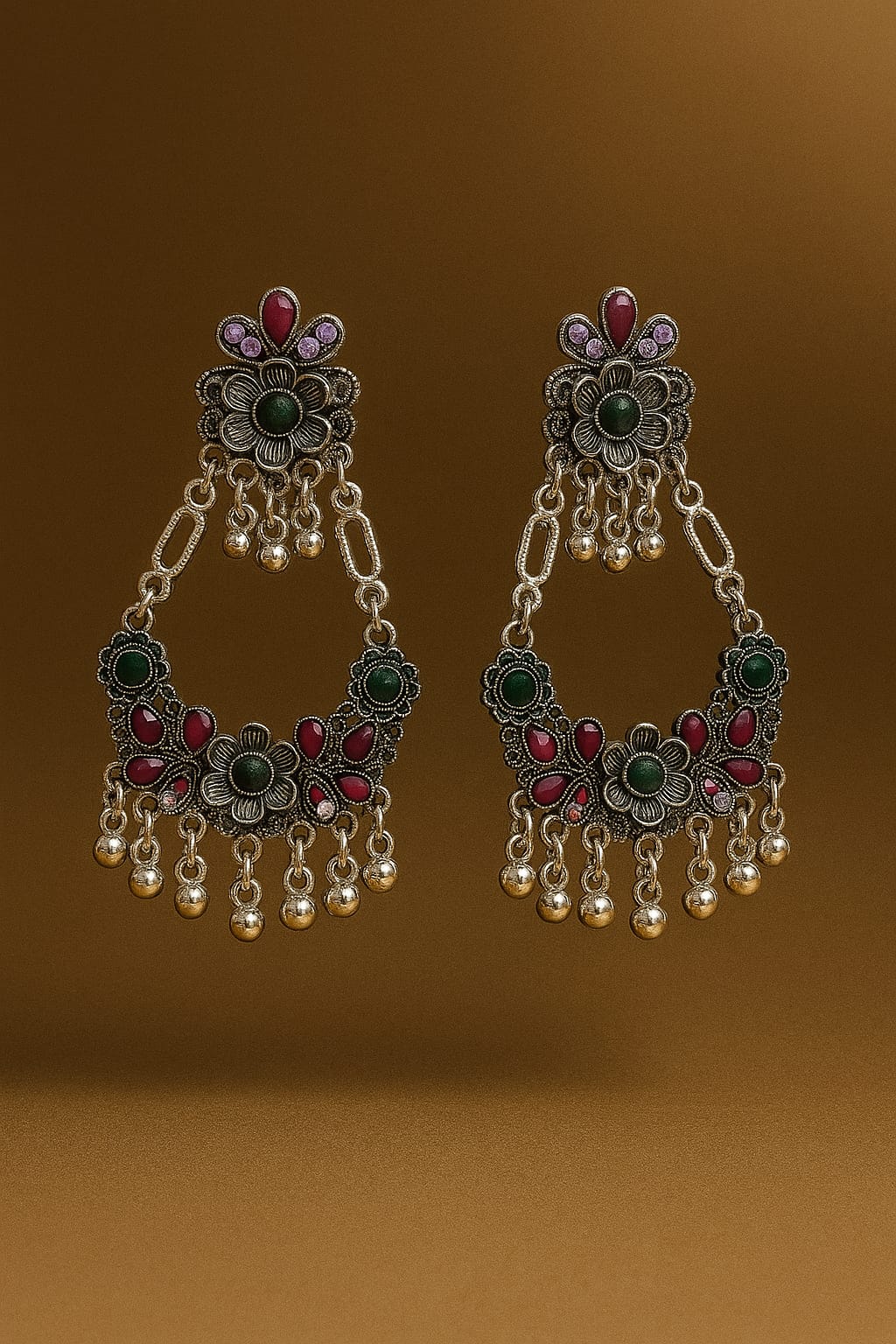 Enhance your ethnic charm with these exquisite oxidized silver floral earrings featuring intricate craftsmanship and vibrant red and green stone accents. The unique floral motif and hanging ghungroo beads add a traditional touch, making them ideal for festive occasions, weddings, or cultural events. Pair them with sarees, lehengas, or kurtis to complete your elegant look.