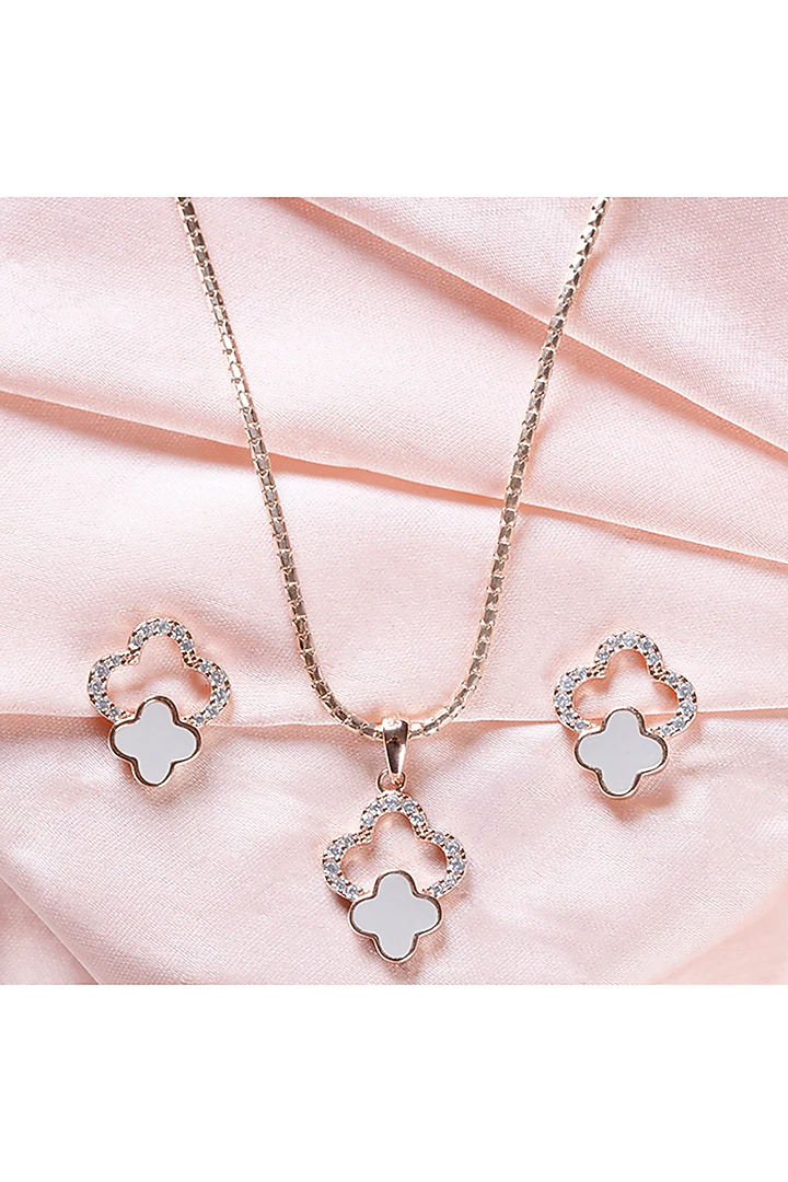Elevate your look with this elegant matching jewelry set. It features a dainty rose gold-plated chain and the iconic quatrefoil/clover-shaped pendant and earrings. The white enamel inlay is framed by shimmering cubic zirconia accents, offering a sophisticated and timeless appeal. Ideal for gifting or adding a touch of classic charm to your everyday or evening wear.