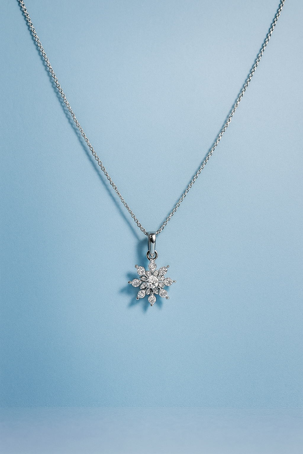 A delicate and brilliant necklace featuring a silver-tone chain and a dazzling snowflake-shaped pendant. The pendant is intricately set with multiple marquise-cut and round crystals that catch the light beautifully. A timeless piece that adds a touch of frosty elegance.